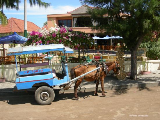 Il fascino di quest’isola, la più vivace e popolata delle Gili - gruppo di isole e largo di Lombok - è dato soprattutto dalla totale assenza di mezzi di trasporto a motore: ci si muove solo a piedi, in bici oppure con carrozze trainate da cavalli “baby”.
